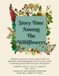 Those events include Gardening Story Time: Hear a story told in a beautiful, blooming garden, then try your hand at planting seeds and caring for the plants. See if you can spot a butterfly or two! Followed by refreshments on the patio. Sundays, June 11, July 23, and August 6, 9:45am-10:45am. Church of Our Saviour Courtyard. Ages K-6th Grade