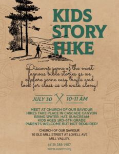 Story Hikes for Kids:Ā Discover some of the most famous bible stories as we explore some easy trails and look for clues as we walk along. Parents welcome but not required! Bring a water bottle, hat, sunscreen, and wear walking shoes or sneakers. Sunday, July 30, 10-11am. Meet at Church of Our Saviour Fireside Room.Ā Ages 3rdā6th Grades.