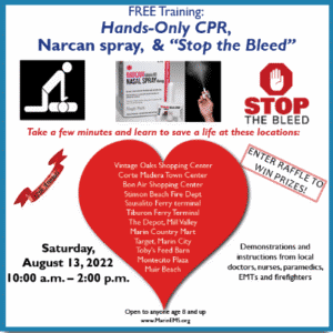 Marin County Emergency Medical Services Agency continues to ramp up its efforts to educate the community on ways to save a life. On Saturday, August 13 from 10am-2pm at locations throughout Marin, they’re hosting a free lifesaving training session.