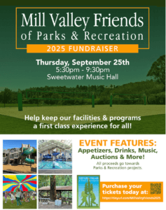 In order to continue our mission to advocate and provide funding forĀ Parks & Recreation programs and improvement of facilities, we need your help. If you arenāt already a supporter of the Mill Valley Friends of Parks and Recreation, donāt miss this opportunity to become one now! “Join us at the iconic Sweetwater for music, fun, drinks, appetizers, as well as meeting new Friends, on Thursday, September 25th from 5:30pm to 9:30pm at 5:30 pm,” says Joan Murray, one of the many board members associated with the Mill Valley Friends. There will be drinks, appetizers, music, auctions and more.Ā 100% of all proceeds will go towards Parks & Recreation projects.