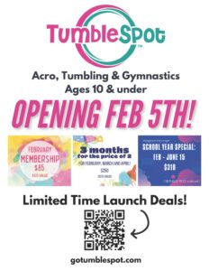 “After closing our doors in 2020, TumbleSpot is back and ready to serve our families again!” Thistle says. “We offer a variety of programs designed to build skills and cultivate fun for children through the age of 10. Our curriculum has been carefully developed by industry professionals and offers incredible growth opportunities for our littlest members through our AcroStars.