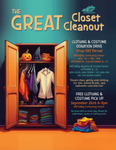 Ready to refresh your wardrobe and help your community? Join us for The Great Closet Cleanout, Mill Valleyās seasonal clothing and costume donation drive! Clear out those closets and give your gently used menās, womenās, and childrenās clothing a second life. Weāre also collecting Halloween costumes to help local families celebrate in style this spooky season. Then, come back for our FREE Clothing & Costume Pick-Up Event where the whole community can browse and take home items at no cost, just in time for fall and Halloween!