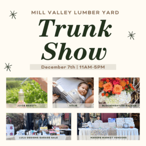 Trunk Show: December 7: 11AM-5PM Mill Valley Lumber Yard Trunk Show! Explore new finds and gifts for the holiday season! Featuring Juice Beauty, Oolie, Makers Market vendors, Lulu Designs Garage Sale, Bloomingayles Bazaar and more!