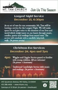 On Thursday, December 21st, 6:30pm – Pastor Luke Ham shares: “As an act of care for our community, Mt. Tam will be hosting a service for the Longest Night. We will make space for and give voice to the elements of our lives and world which weigh heavy on our hearts through music, candles, poetry and readings from sacred texts. The service will conclude with a candlelit labyrinth walk.”