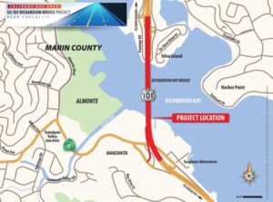 Caltrans is in the midst of a construction project on the Richardson Bridge project that will impact the northbound lanes to replace “the existing asphalt concrete bridge deck surface with polyester concrete in both the northbound and southbound directions of US-101 at Richardson Bay Bridge.