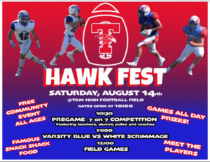 The Tam High Football team is holding its 1st Annual Hawk Fest this Saturday, August 14th from 10:00 to 1:00. The event is a free community event for all ages featuring games all day for kids and adults, prizes, Tam’s famous Snack Shack for breakfast and lunch, and lots of football!