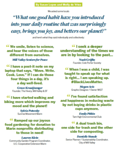 You’ll find these capsules and an array of other inspiring, practical content, from capsules of joy to recipes and events (some day soon, we hope), in our 2020-21 EMV Guide, which appears within the August 2020 issue of Marin Magazine. Want to know what’s happening around town? Click here to subscribe to the Enjoy Mill Valley Blog…