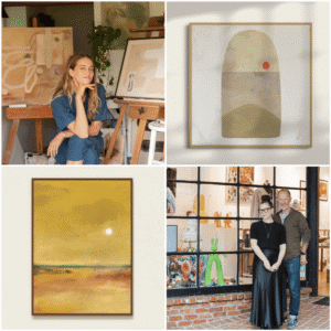 “Danielle’s artwork is modern and down to earth with its neutral palette, pops of colors, and shapes, lines, and textures inspired from the world around her,” says co-curator Powers.”Style and beauty are inherent in her compositions. The artist uses a combination of natural pigments, acrylics, oil pastels and charcoal; she sources natural pigments from stones collected on hikes that she determines to have color, grinding them to powder and using water and walnut oils on raw canvas to let their color make art. These foraged and hand made pigments are archival.”