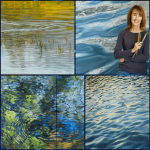 Best known for her water reflection paintings, Geisler creates images that reside somewhere between photorealism and abstraction. Up close, the color use and brushwork read as abstraction, but from a distance, they blend into a more representational depiction.