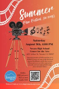 Need a rejuvenating sound fest to beat the summer doldrums? Come join Singers Marin for our concert, a choral Summer Film Festival, where cinematic stories come alive through song. This Hollywood hit parade will bring you some of the best and most uplifting songs from movies that span the decadesāeverything from La La Land, to Black Panther, to the Fellowship of the Ring, and more. The concert will be held at Novato High Center for the Arts, reception with our audience to follow.Tickets are on sale now at https://www.singersmarin.org/new-events. Buy in advance and save $5 on adult tickets!