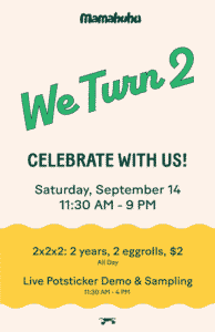 Read MoreMamahuhu Turns Two: 2x2x2: 2 Years, 2 Eggrolls, $2, All Day Long, as Well as a Live Posticker Demo & Sampling, Saturday, Sept. 14, 11:30am-4pm!