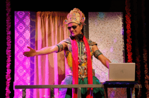 Now they’re onto a very different but equally riveting performance withĀ New Zealand-based Indian Ink Theatre Co. takes command of Marin Theatreās Boyer Theatre, converting it into a capacious storage room/kitchen in the back of Mrs. Krishnanās store, stocked to the rafters with boxes of packaged foods. In colorful party garb, her tenant, a university student and would-be DJ named James (Justin Rogers), greets visitors with a high-performance smile, lots of dazzling repartee and thumping Bollywood disco music to put them in the mood for what proves to be a wildly entertaining 80-minute ride.