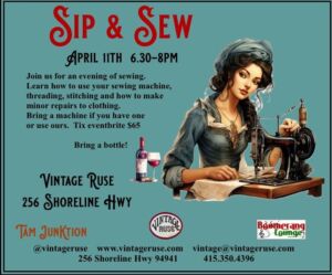 Mercer has hosted just about every event under the sun, all while selling vintage clothing and welcoming all in. On April 11th, Mercer hosts a “Sip & Sew,” a fun evening of sewing ā see image above. 256 Shoreline Hwy., 6:30-8pm. Tix $65.